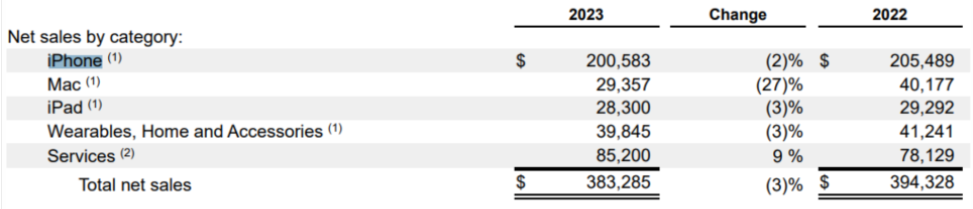최근 미중갈등이 깊어지면서 중국에서 일어난 애플 불매운동과 공무원 아이폰 사용 금지가 영향을 미친 것으로 보이는데, 애플 매출의 절반을 차지하는 아이폰은 438억 1000만 달러로 월가 전망치와 비슷한 수준이었습니다. 여기에는 올해 출시된 아이폰 15 시리즈 매출을 일주일 정도 포함하고 있는 수준임을 고려하면 선전했다는 평가도 있는데요.