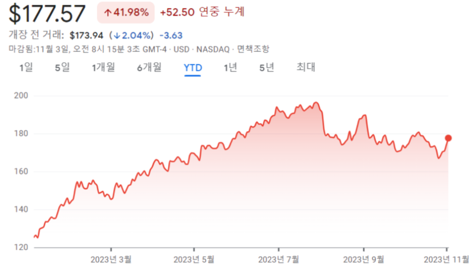 애플은 평소에도 구체적인 가이던스 수치를 제시하지 않는데요. 이번에도 다가오는 4분기 컨센서스에 대해 작년과 비슷한 수준일 것이라고만 말했습니다. 작년 4분기 매출이 1172억 달러였던 것을 고려하면 월가 전망치인 1229억8천만 달러보다는 낮은 수치이죠. 게다가 작년에는 중국 코로나 봉쇄로 꽤 부진했던 시기인지라 다음 4분기 성적도 그리 좋지 않을 것이라 예상해볼 수 있습니다. 이와 같은 모습에 주가는 장 마감 후 3.39% 하락했는데 현재 약 2% 상승하여 177달러대를 유지하고 있습니다. 이번 여름에 200달러를 넘기도 했었는데 당분간 변수가 없는 한, 매수 기회가 많이 있지 않을까 생각됩니다.